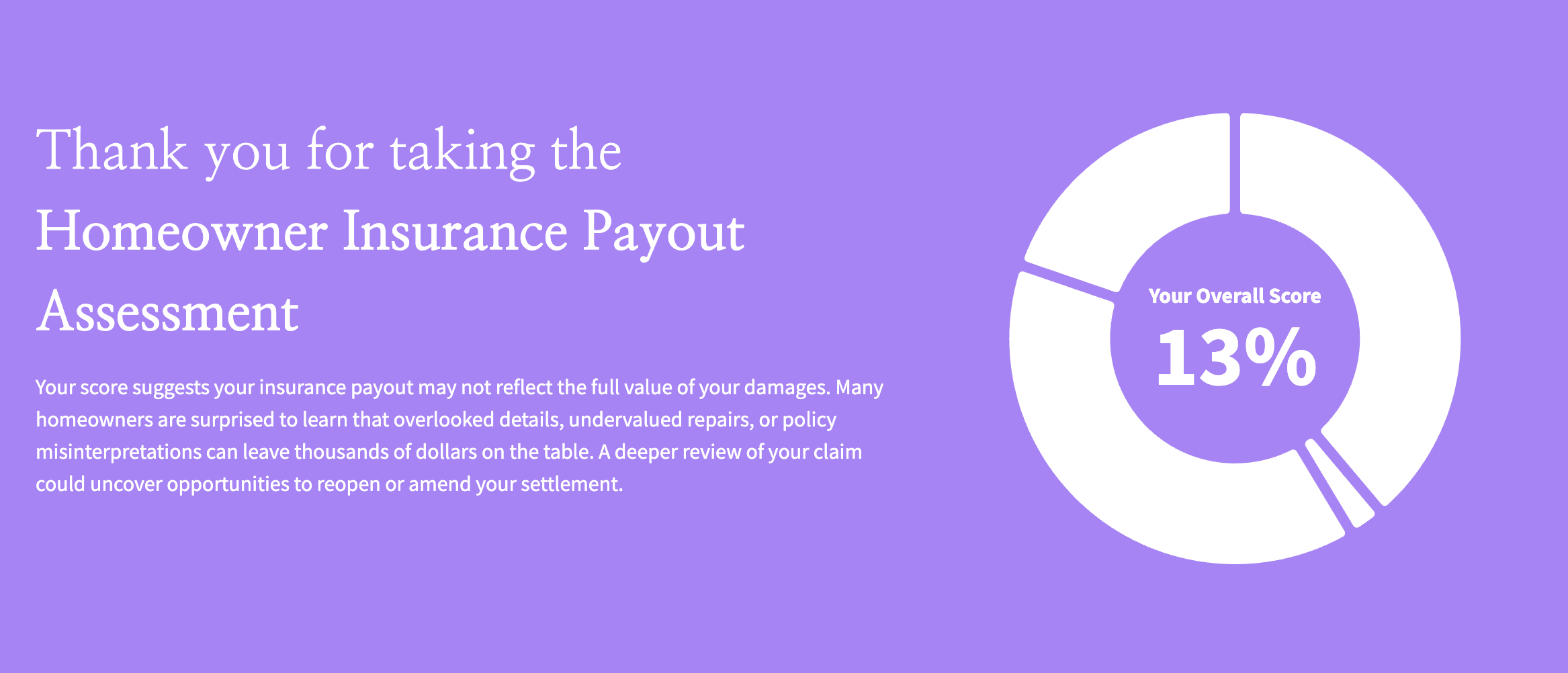 This assessment has been designed to show homeowners their blind spots and provide instant, actionable steps on how to improve their claim settlement.
